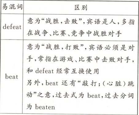 3. defeat v. 战胜,打败;使受挫 n. 失败