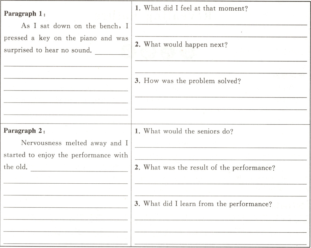 任务三:Paragraph 1: 1. I was nervous and embarrassed. 2. Phyllis came to the front and requested someone to help. 3. Several people stepped forward to help me plug in the piano and set the microphone.