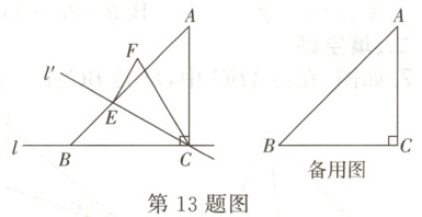 13. 如图,在 $\triangle ABC$ 中,$\angle ACB = 90^{\circ}$,$\angle ABC = 45^{\circ}$,边 $BC$ 在直线 $l$ 上。将直线 $l$ 绕点 $C$ 顺时针旋转到直线 $l^{\prime}$,交 $AB$ 于点 $E$,以 $CE$ 为直角边作直角 $\triangle CEF$,使 $\angle CEF = 90^{\circ}$,$\angle ECF = 30^{\circ}$,点 $F$ 和点 $A$ 始终在直线 $l^{\prime}$ 的同侧。设 $\angle BCE = \alpha(0^{\circ} \lt \alpha \lt 90^{\circ})$。