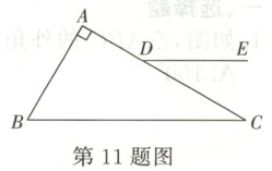11. 如图,在 $\triangle ABC$ 中,$\angle A = 90^{\circ}$,点 $D$ 在 $AC$ 边上,$DE // BC$,若 $\angle ADE = 150^{\circ}$,求 $\angle B$ 的度数。