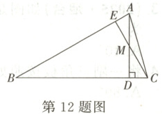 12. 如图所示,在 $\triangle ABC$ 中,$AD$ 是 $BC$ 边上的高,$E$ 是 $AB$ 边上一点,$CE$ 交 $AD$ 于点 $M$,且 $\angle DCM = \angle MAE$,求证:$\triangle AEM$ 是直角三角形。