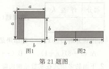 21. (8 分)小明从一张边长为$a$ cm 的正方形纸板上减掉一个边长为$b$ cm 的正方形(如图 1),然后将剩余部分沿虚线剪开并重新拼成一个长方形(如图 2).