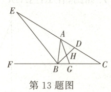 13. 如图,在$\triangle ABC$中,$\angle ABC$的平分线交$AC$于点$D$,作$\angle BAG=\angle C$,$\angle ABF$是$\triangle ABC$的外角,$\angle ABF$的平分线交$CA$的延长线于点$E$。