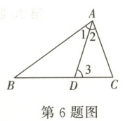 6. 如图,D是△ABC的BC边上一点,∠B = ∠1,∠3 = 80°,∠BAC = 70°。则∠2的大小是(