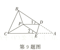9. 如图,在△ABC中,∠ABC、∠ACB的平分线交于点P,将△ABC沿DE折叠使得点A与点P重合,若∠1 + ∠2 = 80°,则∠BPC的度数是(