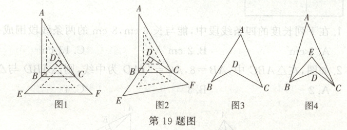 ①如图1,将一块直角三角板DEF放置在直角三角板ABC上,使三角板DEF的两条直角边DE、DF分别经过点B、C,且BC//EF,已知∠A = 30°,∠E = 45°,则∠ABD + ∠ACD =