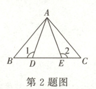 2. 易错题 如图,在△ABC中,D,E是BC边上的两点,AD=AE,BE=CD,∠1=∠2=110°,∠BAE=60°,则∠BAC的度数为(
