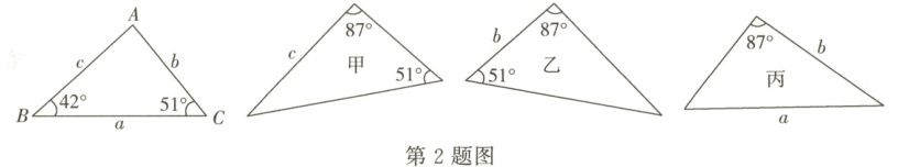 2. 如图,已知△ABC的三条边和三个角,则甲、乙、丙三个三角形中和△ABC一定全等的是(