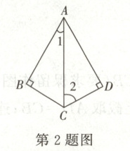 2. 如图,$\angle B=\angle D = 90^{\circ}$,$BC = CD$,$\angle 1 = 30^{\circ}$,则$\angle 2$的度数为(