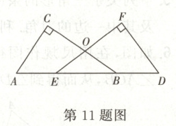 11. 如图,已知$\angle C=\angle F = 90^{\circ}$,$AC = DF$,$AE = DB$,$BC$与$EF$交于点$O$。