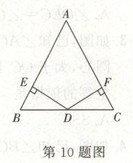 10. 如图,在$\triangle ABC$中,$D$是$BC$的中点,$DE\perp AB$,$DF\perp AC$,垂足分别是点$E$,$F$,且$BE = CF$。