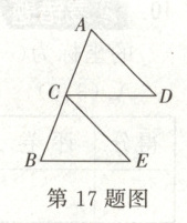 17. (10分)如图,$C$是$AB$的中点,$AD = CE$,$CD = BE$。求证: