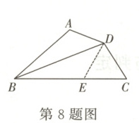 8. 如图,在四边形 ABCD 中,∠A = 120°,∠C = 60°. 若将四边形 ABCD 沿 BD 折叠后,顶点 A 恰好落在边 BC 上的点 E 处(E 与 C 不重合),则∠CDE 的度数为