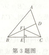 3. 如图所示,在△ABC中,BD平分∠ABC,BC边上的垂直平分线交BC于点E,交BD于点F,连接CF。若∠A=60°,∠ABD=24°,则∠ACF的度数为(