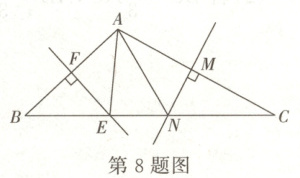 8. 如图,在△ABC中,∠BAC=106°,EF,MN分别是AB,AC的垂直平分线,点E,点N在BC上,则∠EAN的度数是