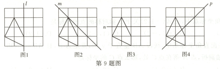 9. 如图,将已知四边形分别在格点图中补成关于已知直线:$ l $、$ m $、$ n $、$ p $ 为对称轴的轴对称的图形。