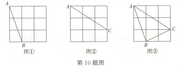 10. 图①、图②、图③都是 $ 3×3 $ 的正方形网格,每个小正方形的顶点称为格点,点 $ A $,$ B $,$ C $ 均为格点。在给定的网格中,按下列要求画图。