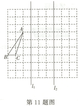 11. (1)如图,请在如图所示的方格纸中画出 $ △ABC $ 关于直线 $ l_1 $ 对称的图形 $ △A_1B_1C_1 $,再画出 $ △A_1B_1C_1 $ 关于直线 $ l_2 $ 对称的图形 $ △A_2B_2C_2 $;