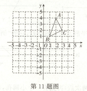 11. 如图,$ \triangle ABC $ 三个顶点的坐标分别为 $ A(2,4) $,$ B(1,1) $,$ C(3,2) $。