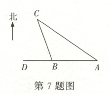 7. 如图,一艘船上午9时从海岛$A$出发,以每小时20海里的速度向正西方向航行,上午11时到达海岛$B$处,分别从$A$,$B$处望灯塔$C$,测得$\angle DAC = 34^{\circ}$,$\angle DBC = 68^{\circ}$,则海岛$B$到灯塔$C$的距离为