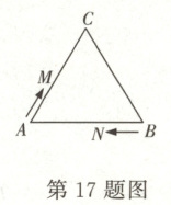 17. 如图,在等边 $\triangle ABC$ 中,$AB = 12\ cm$,现有 $M$,$N$ 两点分别从点 $A$,$B$ 同时出发,沿 $\triangle ABC$ 的边按顺时针方向运动,已知点 $M$ 的速度为 $1\ cm/s$,点 $N$ 的速度为 $2\ cm/s$,当点 $N$ 第一次到达 $B$ 点时,$M$,$N$ 同时停止运动,设运动时间为 $t(s)$。