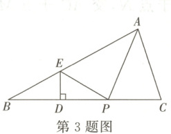 3. 如图,在 $ \triangle ABC $ 中,点 $ D $ 在 $ BC $ 边上,过 $ D $ 作 $ DE \perp BC $ 交 $ AB $ 于点 $ E $,$ P $ 为 $ DC $ 上的一个动点,连接 $ PA $、$ PE $,若 $ PA + PE $ 最小,则点 $ P $ 应该满足(