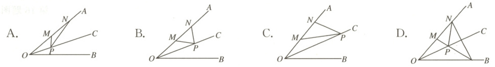 2. 易错题 $ \angle AOB $ 的边 $ OA $ 上有两点 $ M $,$ N $,在 $ \angle AOB $ 的平分线 $ OC $ 上找一点 $ P $,使 $ MP + NP $ 最小,下列选项中正确的作法是(
