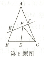 6. 如图,$ \triangle ABC $ 的面积为 12,$ AB = AC $,$ BC = 4 $,$ AC $ 的垂直平分线 $ EF $ 分别交 $ AB $,$ AC $ 于点 $ E $,$ F $,若点 $ D $ 为 $ BC $ 边的中点,点 $ P $ 为线段 $ EF $ 上一动点,则 $ \triangle PCD $ 周长的最小值为(