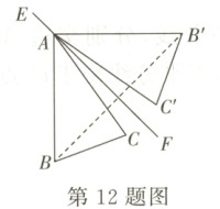 12. 如图,在$\triangle ABC$中,$\angle ABC = \angle C = 75^{\circ}$,$\triangle AB'C'$与$\triangle ABC$关于直线$EF$对称,$\angle CAF = 10^{\circ}$,则$\angle CAB'$的度数为