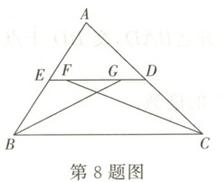 8. 如图,在$\triangle ABC$中,$DE// BC$,$\angle ABC$和$\angle ACB$的平分线分别交$ED$于点$G$,$F$,若$FG = 2$,$ED = 5$,则$BE + DC$的值为(