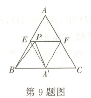 9. 如图,在边长为$2$的等边$\triangle ABC$中,点$E$,$F$分别在$AB$,$AC$上,且$EF// BC$,将$\triangle AEF$翻折使点$A$落在$BC$上的点$A'$处,点$P$是$EF$上一个动点,连接$BP$,$A'P$,则$\triangle BPA'$的周长的最小值为(