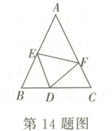 14. 如图,在等腰$\triangle ABC$中,$AB = AC = 11$,$BC = 8$,$\angle A = 40^{\circ}$,点$D$,$E$,$F$分别在边$BC$,$AB$,$AC$上,$DE = DF = 5$,$\angle EDF = 70^{\circ}$,则$\triangle CDF$的周长为