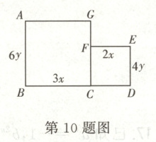 10. 如图,四边形$ABCG$和四边形$CDEF$都是长方形,若$AB = 6y$,$BC = 3x$,$DE = 4y$,$EF = 2x$,则它们的面积之和为