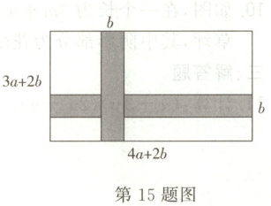 15. 如图,为提高业主的宜居环境,某小区物业准备在一个长为 $(4a + 2b)$ 米,宽为 $(3a + 2b)$ 米的长方形草坪上修建两条宽为 $b$ 米的小路,求小路的面积.(要求化成最简形式)
