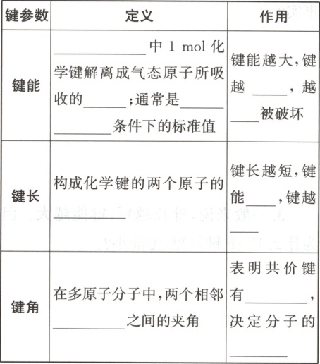 二、1.气态分子 能量 298.15K、101kPa 稳定 难 核间距 越大 稳定 共价键 方向性 空间结构2.稳定性 空间结构
