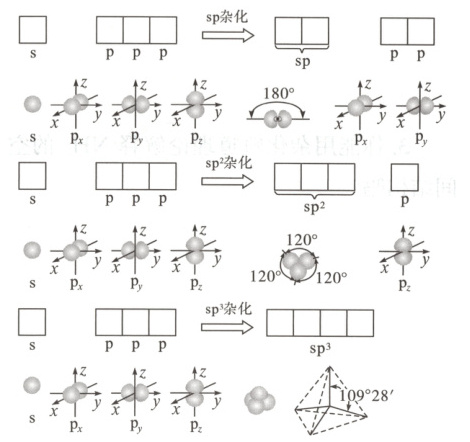 在形成多原子分子时,中心原子价电子层上的某些能量相近的原子轨道发生混杂,重新组合成一组新的轨道的过程,叫做轨道的杂化。双原子分子中,不存在杂化过程。例如 $ sp $ 杂化、$ sp^2 $ 杂化、$ sp^3 $ 杂化的过程如下: