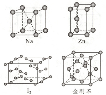 2. 下图依次是金属钠(Na)、金属锌(Zn)、碘(I₂)、金刚石(C)晶胞的示意图,数一数,它们分别平均含有几个原子?