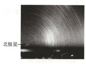 晴朗的夜晚,北极圈及其以北地区的某地,一位天文爱好者用三脚架固定好相机,并将相机尽可能对准北极星,把焦距定在无限远,将光圈全部打开。在冲洗出的胶片上显示恒星绕北极星做圆周运动,如右图所示。