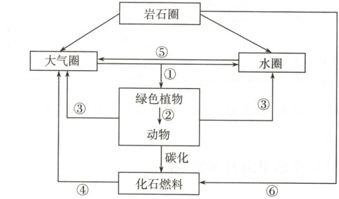 倡导发展低碳经济和低碳生活已成为当今社会的主旋律。下图为碳物质在地球各圈层中的循环过程示意图。读图,完成 6~7 题。
