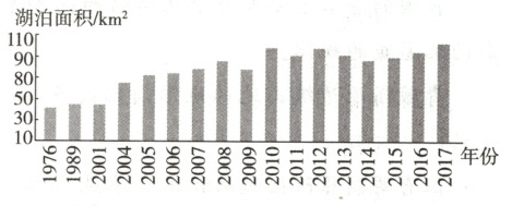 位于柴达木盆地中北部的小柴旦湖(也叫巴夏柴达木湖),属于咸水湖。2018 年 5 月湖泊面积为 102.09 平方千米,2018 年 10 月 6 日面积扩大到 123.68 平方千米,为 1976 年以来的最大值。右图示意 1976—2017 年巴夏柴达木湖面积变化。据此完成 8~10 题。