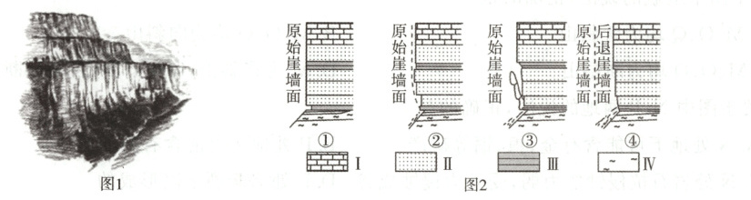 我国太行山东侧发育有嶂石岩地貌。图1是某处嶂石岩景观的素描图,呈现出自上而下三级阶梯状的陡崖,其形成过程如图2中①~④所示(图例Ⅰ~Ⅳ分别代表不同岩层)。读图,完成3~5题。