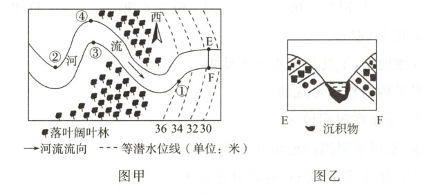 图甲为大陆东岸的某河段示意图,图乙为图甲中EF处的河床横断面图。读图,完成9~10题。