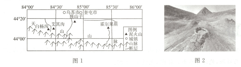 “泥火山”指泥浆和气体同时喷出地面堆积而成的锥形丘或盆穴丘,丘的尖端常有凹陷,并由此间断地喷出泥浆与气体,在新疆天山北麓分布着众多“泥火山”,喷发出的黏稠泥浆温度比当地气温低,略带油气味,不时冒出几个气泡。图1为新疆天山北麓“泥火山”分布图,图2为“泥火山”景观图。据此完成7~9题。