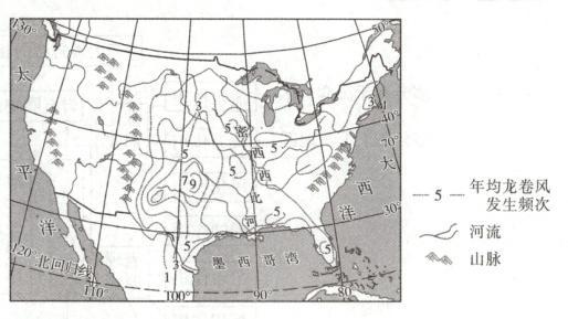 答:美国本土中部平原春季,来自北冰洋的冷气团与来自墨西哥湾的湿热气团常在此交汇,湿热气团强烈抬升;春季气温回升快,下热上冷易造成上下层空气交换,促使气流上升;中部平原地形平坦,对气流旋转的阻挡作用弱,利于龙卷风形成。