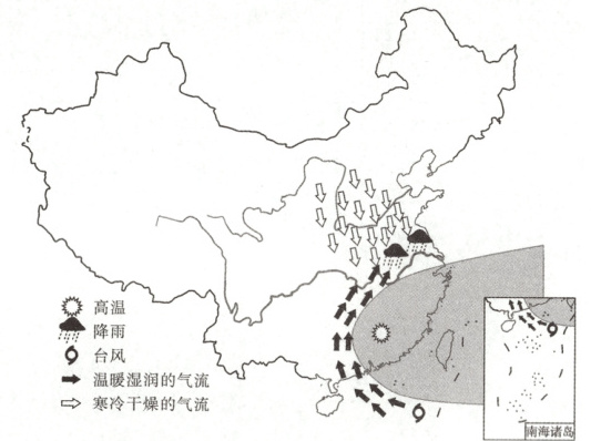 1. 7~8月。理由:雨带位于华北地区(副高脊线以北5~8个纬度,约30°N~38°N);图示有台风活动(夏秋季多发);长江中下游地区受副高控制,出现高温少雨(伏旱)天气。