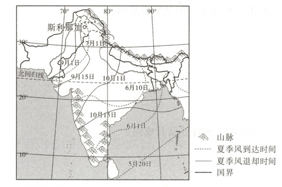 南亚地区的气候状况由冬、夏季大气环流形势决定。下图示意南亚地区夏季风进退时间。据此完成8~10题。