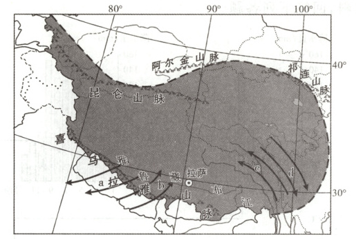 存在于高原周围地区、冬夏季方向相反的大气环流,称为高原季风。下图中箭头表示青藏高原形成的高原季风方向。读下图,完成5~7题。