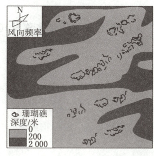 研究发现,珊瑚礁形态受盛行风影响。右图示意某海域珊瑚礁群岛的分布。读图,完成3~4题。