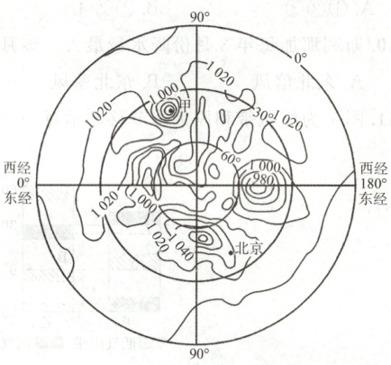 右图为北半球某日2时海平面气压(单位:hPa)分布图。读图,完成1~2题。