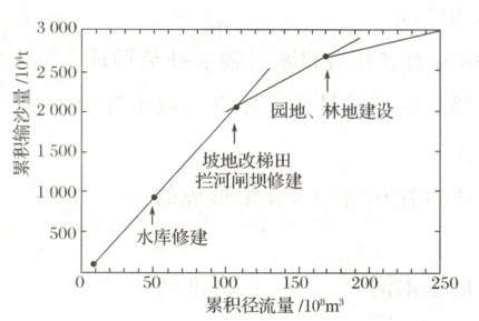 山东半岛某入海河流的流域内在 1952—2009 年修建了大量水库,实施大面积坡耕地改梯田、拦河闸坝修建及大规模林地、园地建设等,但该河流输入海洋的泥沙受其影响不大。下图示意 1952—2009 年该河流入海年径流量($ 10^{8}m^{3} $)、输沙量($ 10^{4}t $)累积折线图(图中数据为河口水文站监测资料)。据此完成 8~10 题。